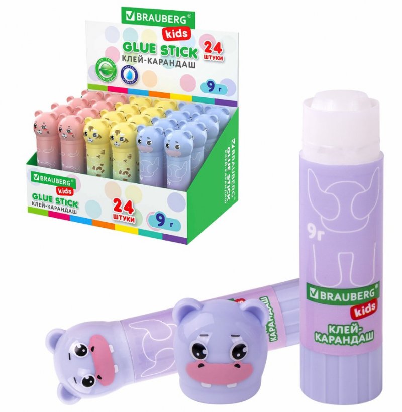 - Клей-карандаш "Пастельные зверята: мышка, тигр, бегемот" 9 г, фигурный колпачок,BRAUBERG KIDS,271140
