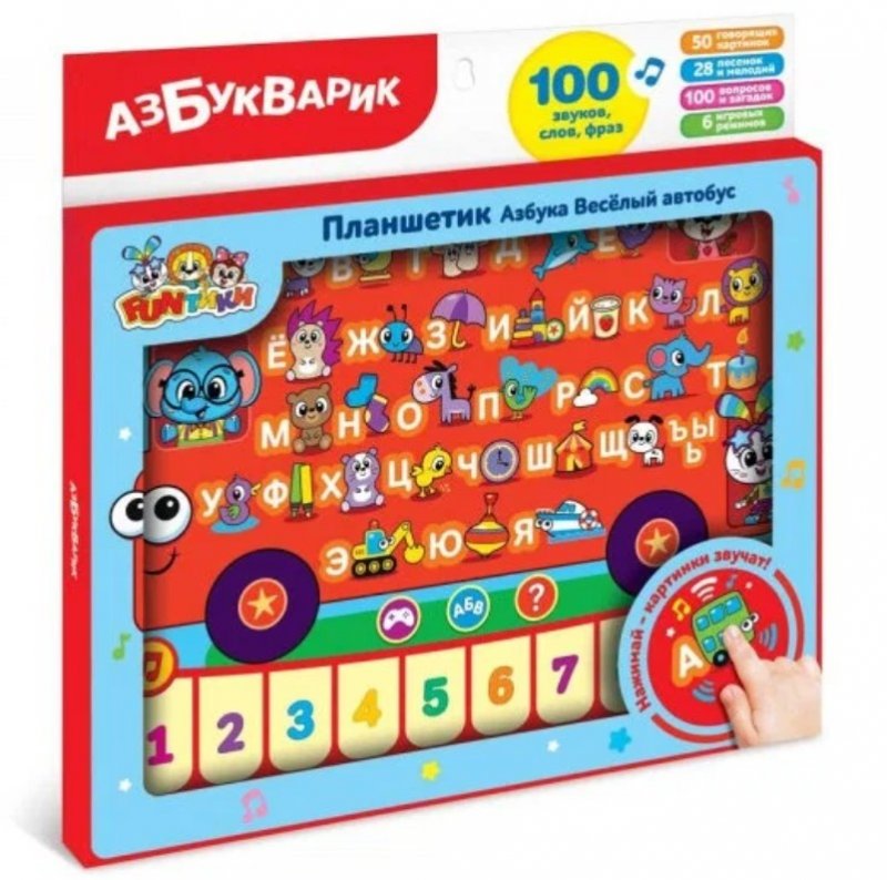 На планшете изображено 50 говорящих картинок, по которым непоседа изучает алфавит в режиме «Буквы, звуки и слова». Чтобы занятия доставили еще больше удовольствия, можно включить 100 вопросов и загадки в стихах.