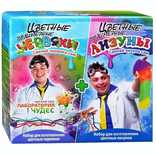 Забавных лизунов и червяков теперь можно сделать своими руками. В этом наборе предусмотрен исходный материал для их изготовления – полимер, а также активаторы для придания формы изделиям. Четко следуя инструкции, ребёнок в итоге получит яркие аксессуары для игры, а также узнает о свойствах полимеров и их реакции с другими веществами.