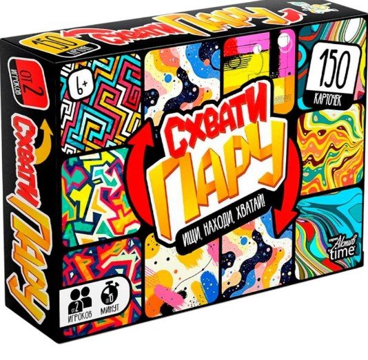 Размер упаковки: 17,3 х 12,2 х 3,3 см Размер изделия: 17,3 х 12,2 х 3,3 см Функционал: настольная игра Вид упаковки: картонная коробка Страна производитель: Россия Материал: картон Комплектация: карточки - 150 шт, правила - 1 шт Возраст ребенка: для детей от 6 лет Настольная игра «Схвати пару». Ищи, находи, хватай – это вихрь эмоций, где каждая секунда на счету, игра на скорость и внимательность, где побеждает самый быстрый и зоркий! Характеристики: - карточки 6х6 см - в игре есть 3 захватывающих режима - качественная печать