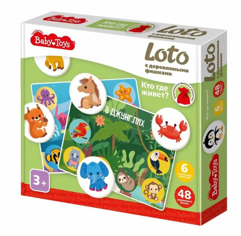 Лото с деревянными фишками Кто где живет? Baby Toys. Состав игры: картонные карточки – 6 (14,5 х 19 см), фишки деревянные – 48 (диаметр – 4 см, толщина – 0,3 см), мешочек из ткани для фишек – 1 (30 х 18 см). Материалы: древесный материал, картон, текстильный материал. Игра предназначена для детей от 3 лет, для 1–6 игроков.