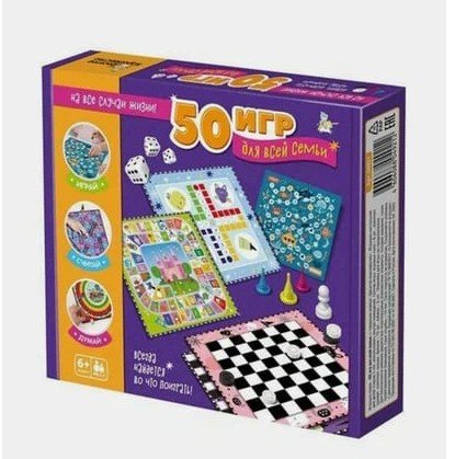 Игра настольная "50 игр для всей семьи". Состав набора: игровые поля - 8 штук (19 х 19 см), - игральные кубики - 5 штук, фишки - 16 штук, шахматные фигуры -32 штуки, шашки - 30 штук, правила игры. Материалы: картон, бумага, полимерный материал. Для детей старше 6 лет и взрослых.