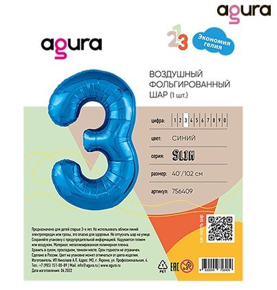 Шар фольгированный "Цифра 3" 40/100см Синий 1207-5024